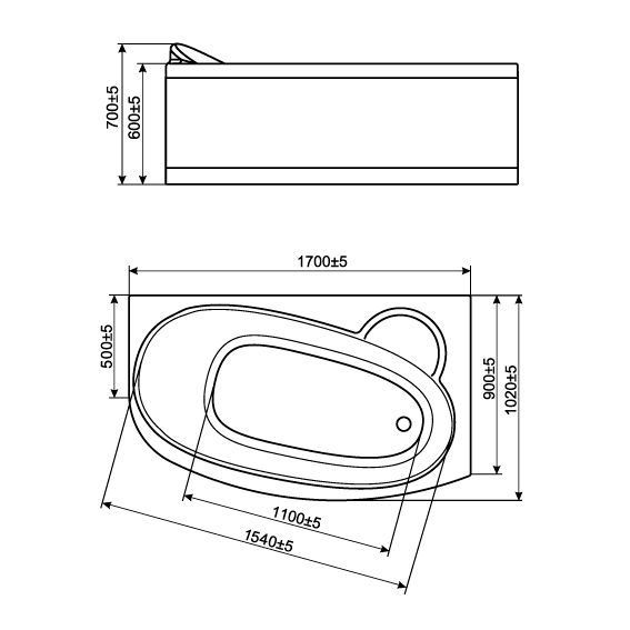 - Примыкание по стене: 900 × 1700 мм