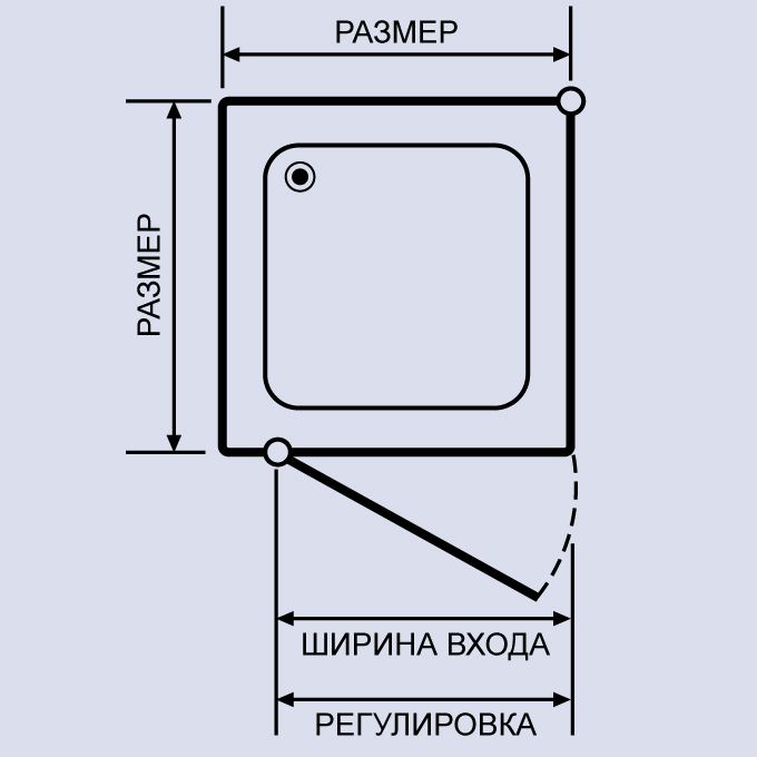 | Размер | Цвет профиля | Стекло | Ширина входа | Регулировка | Артикул |