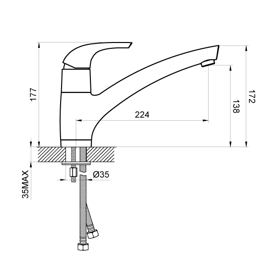- Гибкий подвод воды, длинна шлангов 35 см, гайка 1/2 дюйма