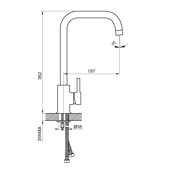 - Гибкий подвод воды, длинна шлангов 35 см,