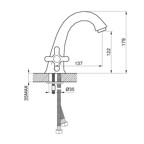 - Гибкий подвод воды, длинна шлангов 35 см,